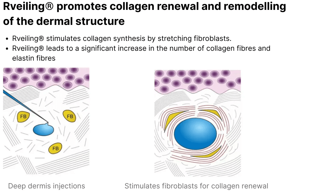 交联透明质酸具有稳定的三维结构,可以抵抗皮肤中的自然酶溶解,虽然非交联透明质酸在几天到一周内分解,但交联透明明质酸可以在体内持续数月、甚至更长时间,提供更特久的填充和保湿效果,Rveiling®采用HA自然缠绕交联技术与高效的BDDE修饰交联工艺,确保产品应用,良好的生物相容性和效果的持久性。