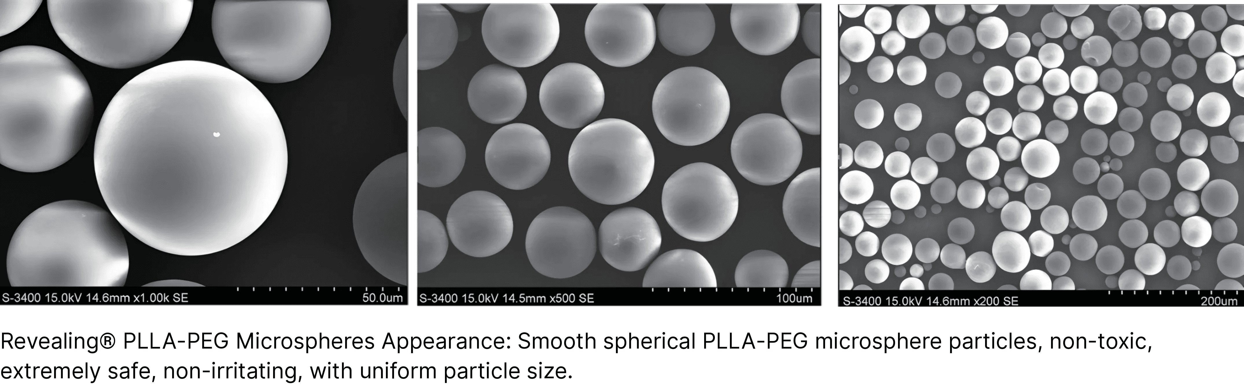 Rveiling® PLLA-PEG微球外观,球面光滑的PLLA-PEG微球颗粒,无毒、安全性极高、无刺激、粒径均一、植入软组织生物应答效果对比