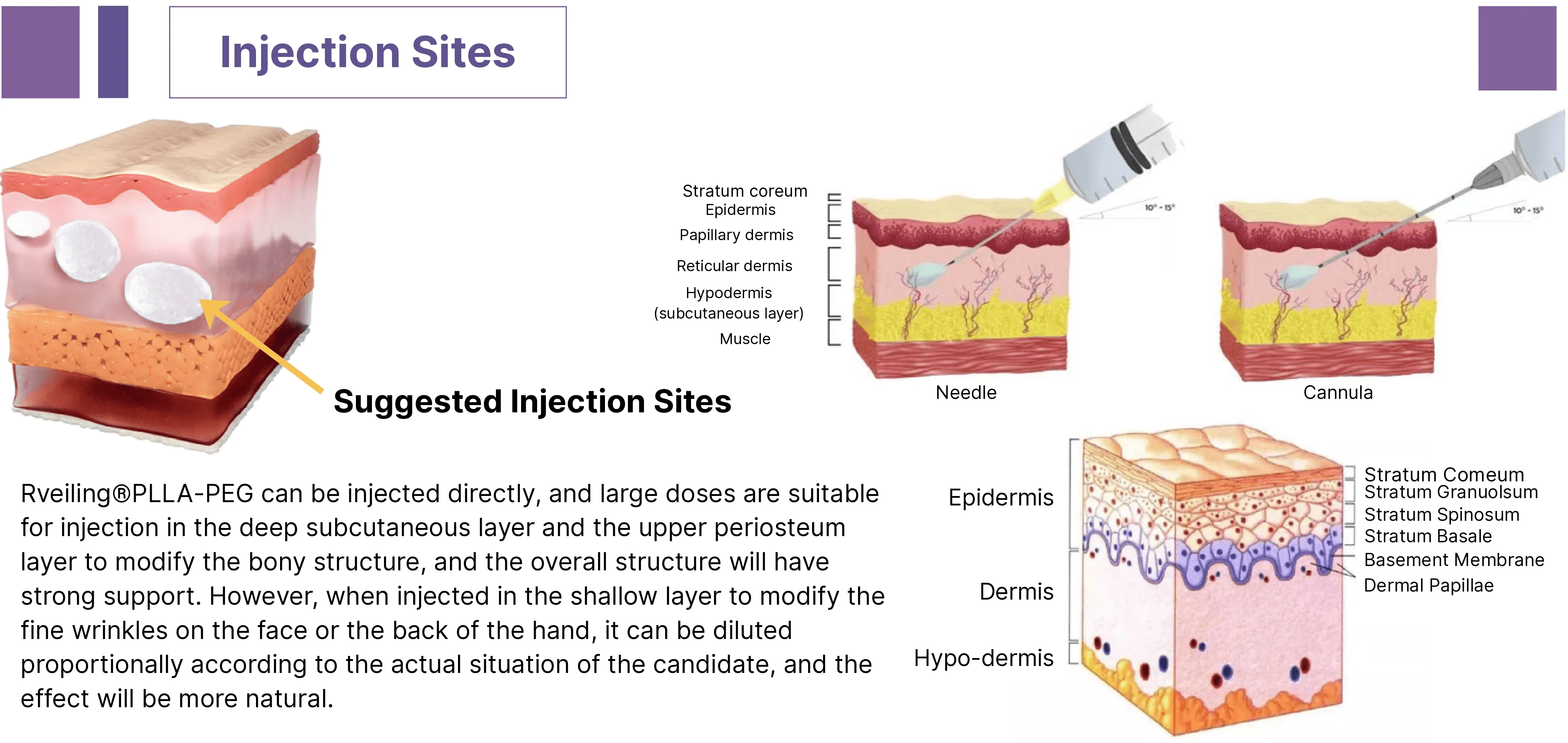 Rveiling®PLLA-PEG稀释溶液注射植入至外侧脸颊骨膜上层及真皮深层软组织,剂量及注射方案