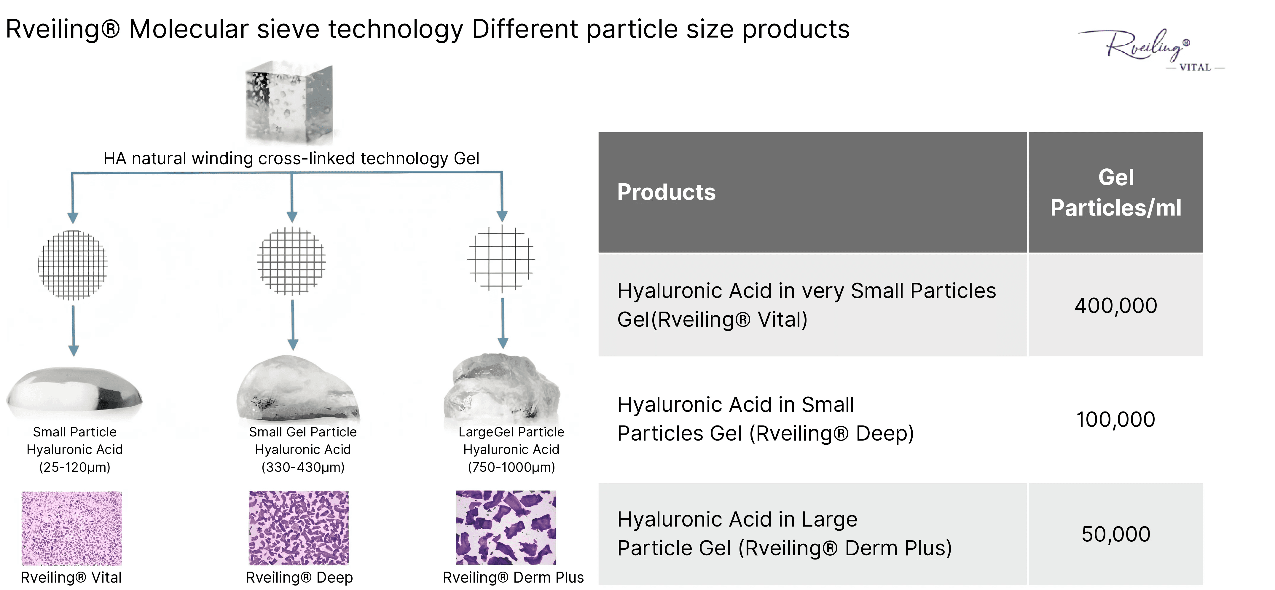 Rveiling® Vital为微交联微小颗粒结构、每毫升含约40万个微粒子凝胶体颗粒,少量游离透明质酸钠凝胶组成,透明质酸钠以微生物发酵法制备的主要原料,封装于一次性使用预灌封注射器中。盐酸利多卡因的添加可减少患者治疗过程中的疼痛。